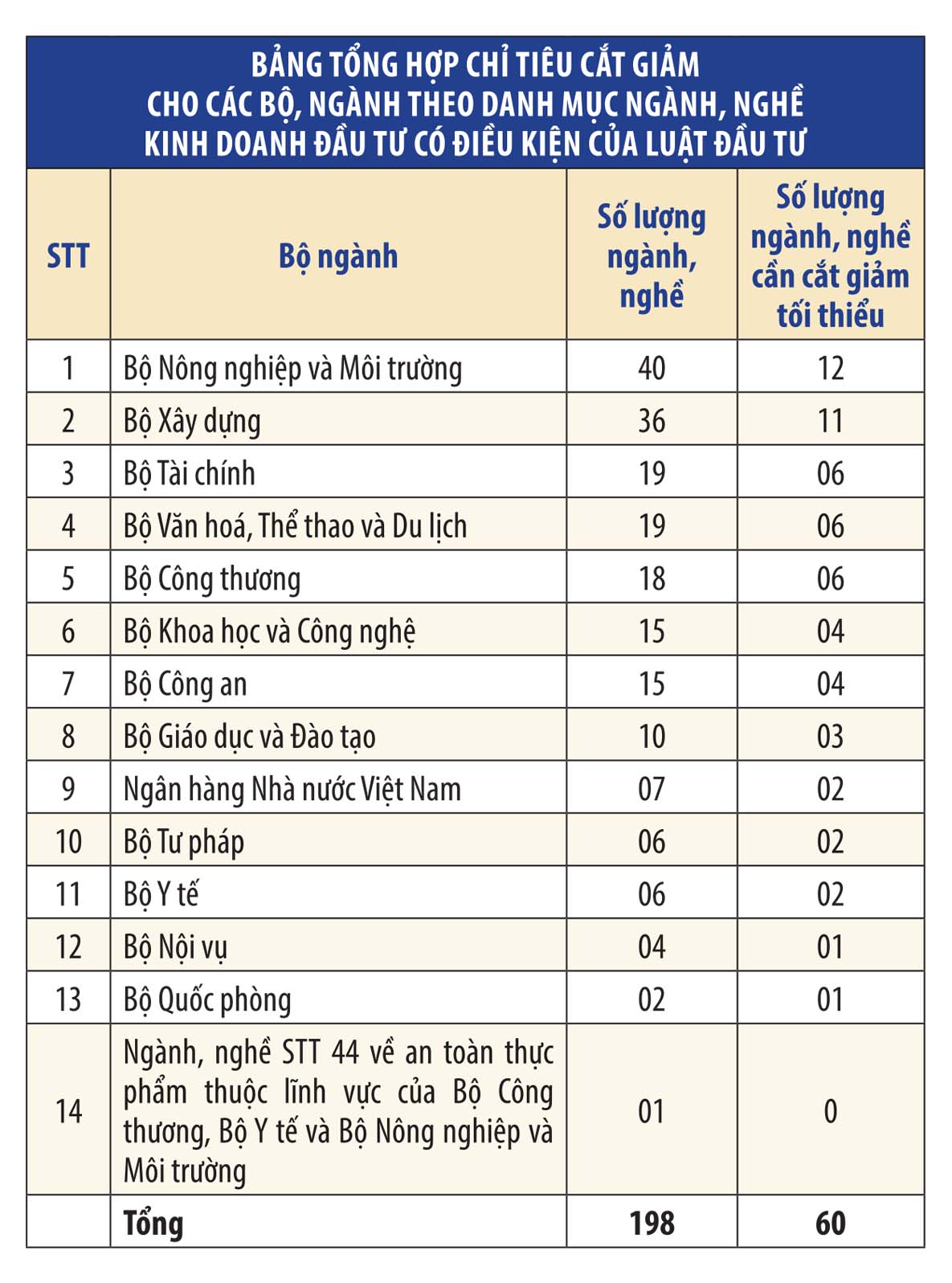 Cũng vào cuối tuần trước, Bộ Tài chính đã gửi các bộ, ngành danh sách các ngành, nghề kinh doanh có điều kiện và chỉ tiêu cụ thể cần cắt giảm cho từng bộ, ngành. Tỷ lệ này ở mức tối thiểu, 30% số lượng ngành, nghề thuộc phạm vi do bộ, ngành quản lý.