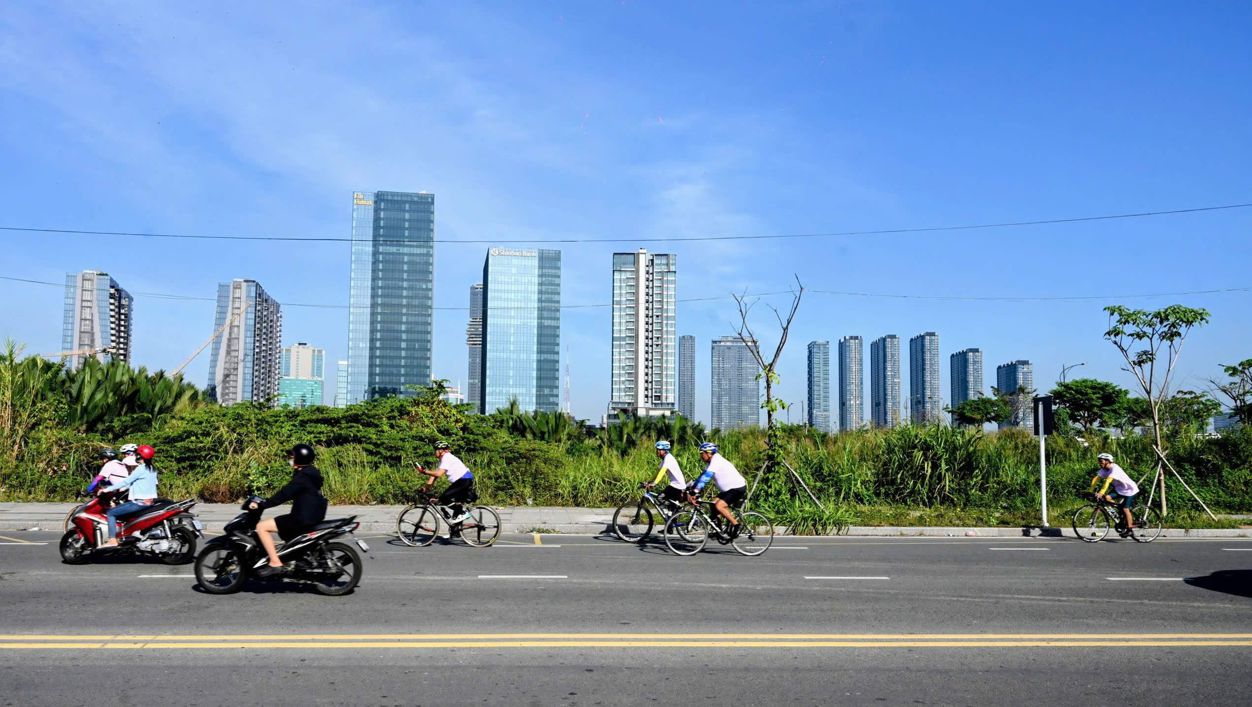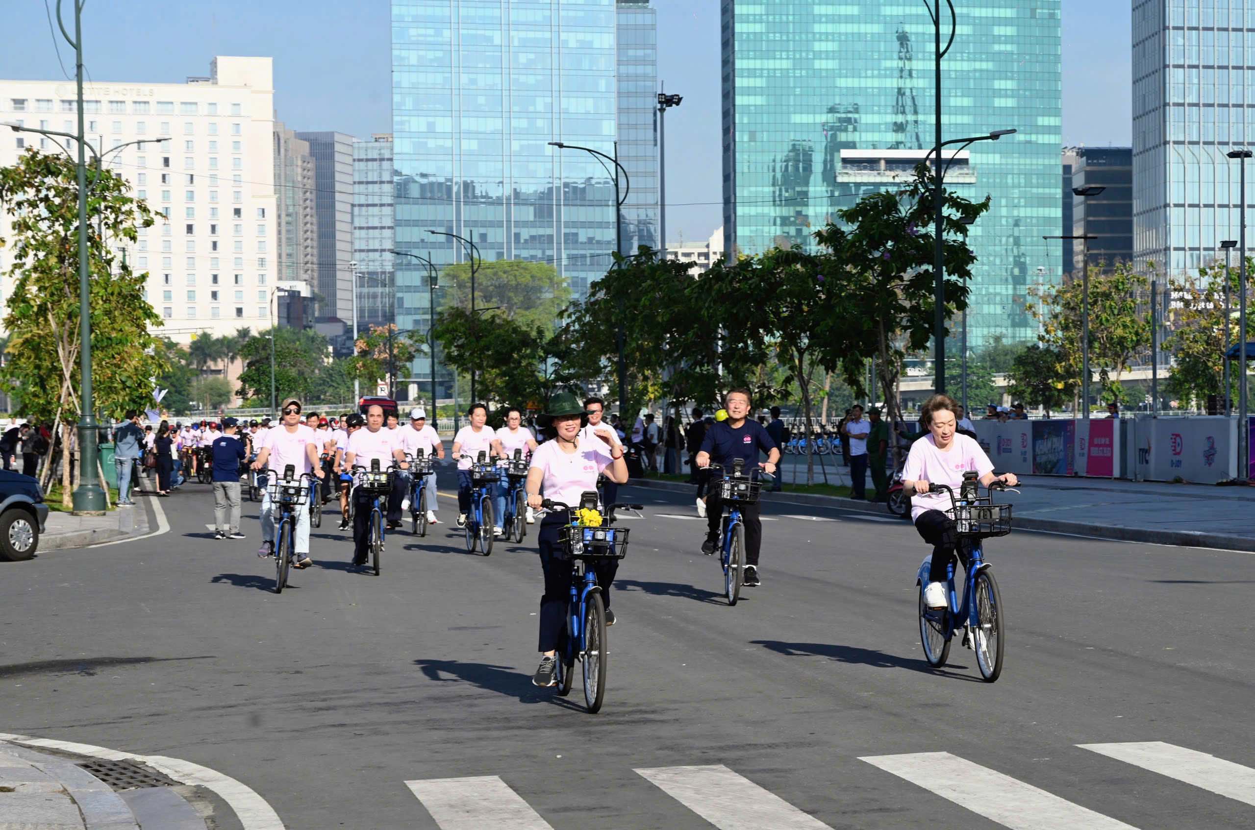 | Sau nghi thức chụp ảnh lưu niệm, đoàn đại biểu cùng các vận động viên đã xuất phát đạp xe theo lộ trình dài khoảng 3,5 km qua các tuyến đường N12, Tố Hữu, Mai Chí Thọ và Nguyễn Cơ Thạch (phường An Khánh, TP.HCM). |