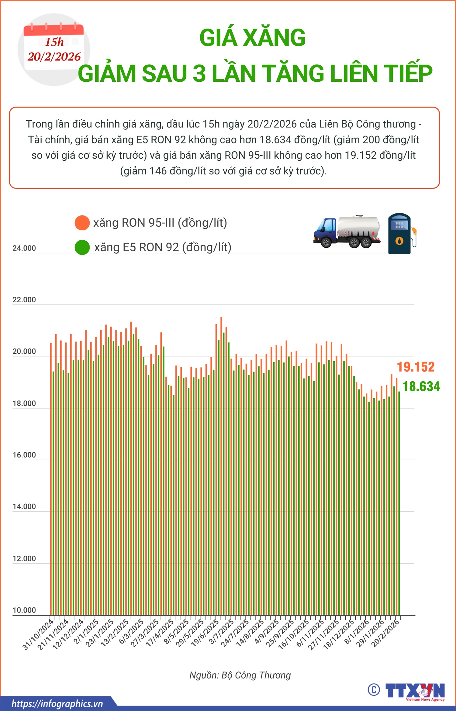 Trong lần điều chỉnh giá xăng, dầu lúc 15h ngày 20/2/2026 của Liên Bộ Công thương - Tài chính, giá bán xăng E5 RON 92 không cao hơn 18.634 đồng/lít (giảm 200 đồng/lít so với giá cơ sở kỳ trước) và giá bán xăng RON 95-III không cao hơn 19.152 đồng/lít (giảm 146 đồng/lít so với giá cơ sở kỳ trước).