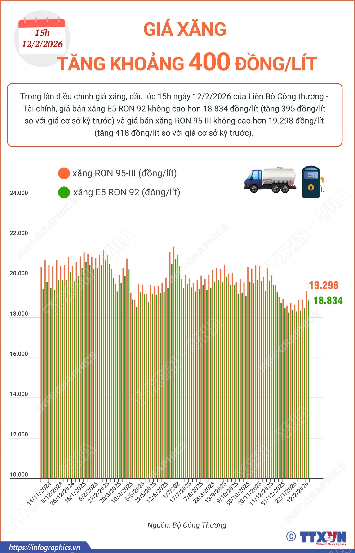 Trong lần điều chỉnh giá xăng, dầu lúc 15h ngày 12/2/2026 của Liên Bộ Công thương - Tài chính, giá bán xăng E5 RON 92 không cao hơn 18.834 đồng/lít (tăng 395 đồng/lít so với giá cơ sở kỳ trước) và giá bán xăng RON 95-III không cao hơn 19.298 đồng/lít (tăng 418 đồng/lít so với giá cơ sở kỳ trước).